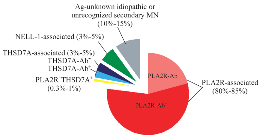 在PMN中,PLA2R相關(guān)膜性腎病約占80%~85%,其中75%~80% 血清抗體陽(yáng)性,20%~25%血清抗體陰性;THSD7A相關(guān)膜性腎病占2%~4%,其中還有很小一部分表現(xiàn)為PLA2R和THSD7A雙陽(yáng)性;NELL-1相關(guān)膜性腎病占PLA2R陰性PMN的5%~25%。對(duì)于均陰性的患者,可能是不明抗原的PMN或者未被識(shí)別的繼發(fā)性膜性腎病。