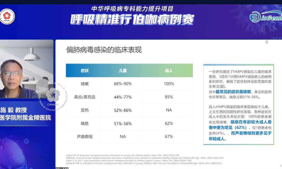 成人HMPV感染的臨床表現(xiàn)類似于兒童。回顧性研究發(fā)現(xiàn),在成人中100%的患者都會(huì)出現(xiàn)咳嗽,喘息在年齡較大成人患者中更為常見(62%)。