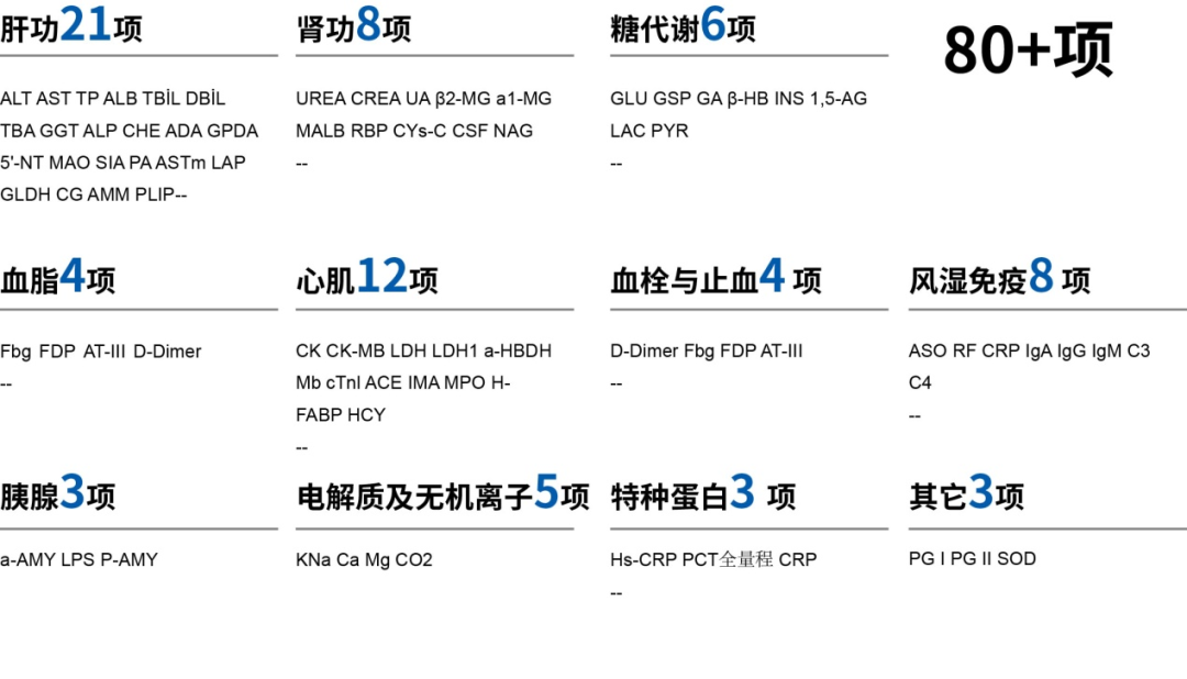 凱成生物作為國內(nèi)生化體外診斷試劑專業(yè)制造商,目前擁有肝功能、腎功能、糖代謝、血脂、心肌、胰腺、電解質(zhì)、血栓與止血、風(fēng)濕免疫、特種蛋白等11大類80+個(gè)檢測項(xiàng)目: