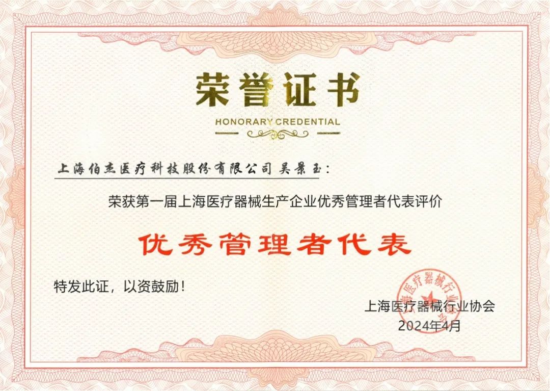 第一屆上海市醫(yī)療器械生產(chǎn)企業(yè)優(yōu)秀管理者榮譽(yù)不僅是對吳景玉本人在生產(chǎn)質(zhì)量管理的認(rèn)可,也是相關(guān)主管部門對伯杰醫(yī)療的肯定。通過此次評價工作,進(jìn)一步強(qiáng)化了企業(yè)的質(zhì)量安全主體責(zé)任意識,提升醫(yī)療器械生產(chǎn)企業(yè)管理者代表的社會影響力,有利于充分發(fā)揮高素質(zhì)人才的引領(lǐng)示范作用,促進(jìn)醫(yī)療器械產(chǎn)業(yè)的高質(zhì)量發(fā)展。