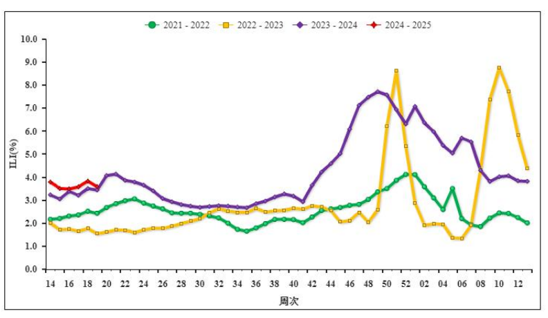 2024年第19周,北方省份哨點(diǎn)醫(yī)院報(bào)告的 ILI%為3.6%,低于前一周水平(3.8%),高于2021~2023年同期水平(2.4%、1.6%和 3.4%)。