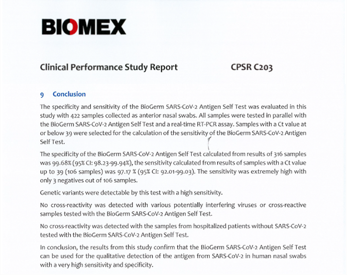 在德國BIOMEX醫(yī)學實驗室出具的檢測報告中,伯杰醫(yī)療所研發(fā)的新型冠狀病毒2019-nCoV抗原檢測試劑盒以靈敏度97.17%、特異性99.68%受到了極高的肯定與推薦。
