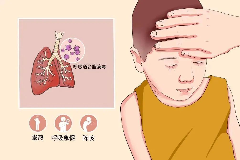 6月齡以下嬰兒:易發(fā)展為毛細(xì)支氣管炎或肺炎,表現(xiàn)為發(fā)熱、鼻塞、劇烈咳嗽、喘息、呼吸急促(呼吸次數(shù)>50次/分鐘)、喂養(yǎng)困難,嚴(yán)重時出現(xiàn)口唇發(fā)紺、胸壁凹陷。