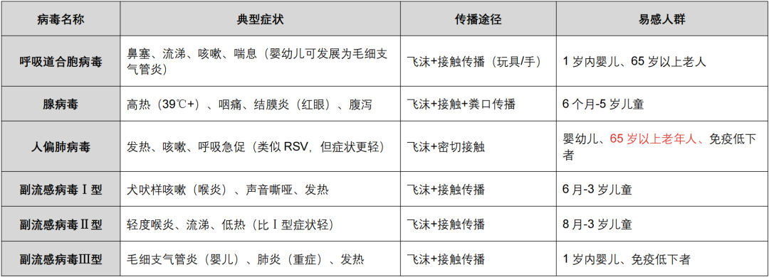 不同病毒感染的癥狀雖有相似之處(均以發(fā)熱和呼吸道癥狀為主),但也存在細(xì)微區(qū)別:流感的典型表現(xiàn)是高熱不退+肌肉關(guān)節(jié)酸痛;鼻病毒以上呼吸道不適為主,肌肉酸痛不明顯;呼吸道合胞病毒更“青睞”低齡嬰幼兒,可能伴隨喘息癥狀。