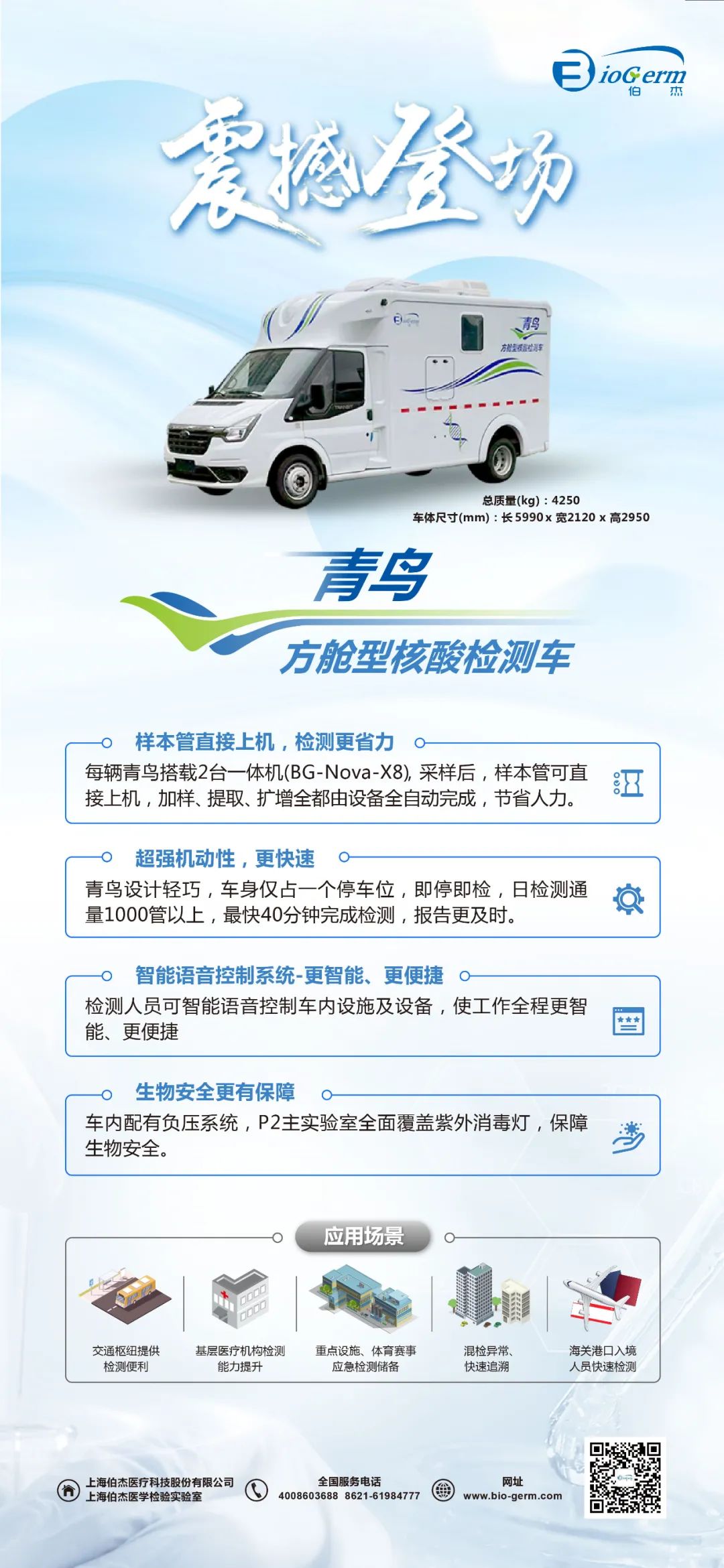 針對(duì)目前的市場(chǎng)需求,更好的助力疫情防控,提速核酸檢測(cè)時(shí)間,伯杰醫(yī)療從實(shí)際應(yīng)用場(chǎng)景出發(fā),研發(fā)推出了青鳥(niǎo)方艙型移動(dòng)核酸檢測(cè)車(chē),其僅占用1個(gè)普通車(chē)位,卻能實(shí)現(xiàn)大型核酸檢測(cè)車(chē)的日檢千管標(biāo)準(zhǔn),同時(shí)搭載其自主研發(fā)集全自動(dòng)加樣、核酸提取、擴(kuò)增檢測(cè)、結(jié)果分析于一體的恒溫核酸擴(kuò)增檢測(cè)分析儀BG-Nova-X8(查看最新產(chǎn)品介紹),將原來(lái)需要3-6小時(shí)才能完成的新冠常規(guī)核酸檢測(cè)提速至40min!