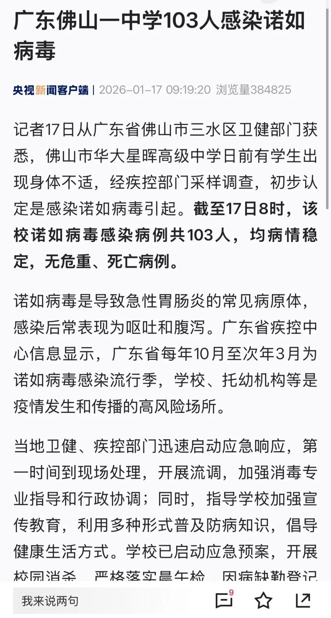 據(jù)央視新聞報(bào)道,佛山市某高級(jí)中學(xué)日前有學(xué)生出現(xiàn)身體不適,經(jīng)疾控部門(mén)采樣調(diào)查,初步認(rèn)定是感染諾如病毒引起。截至17日8時(shí),該校諾如病毒感染病例共103人,均病情穩(wěn)定,無(wú)危重、死亡病例。