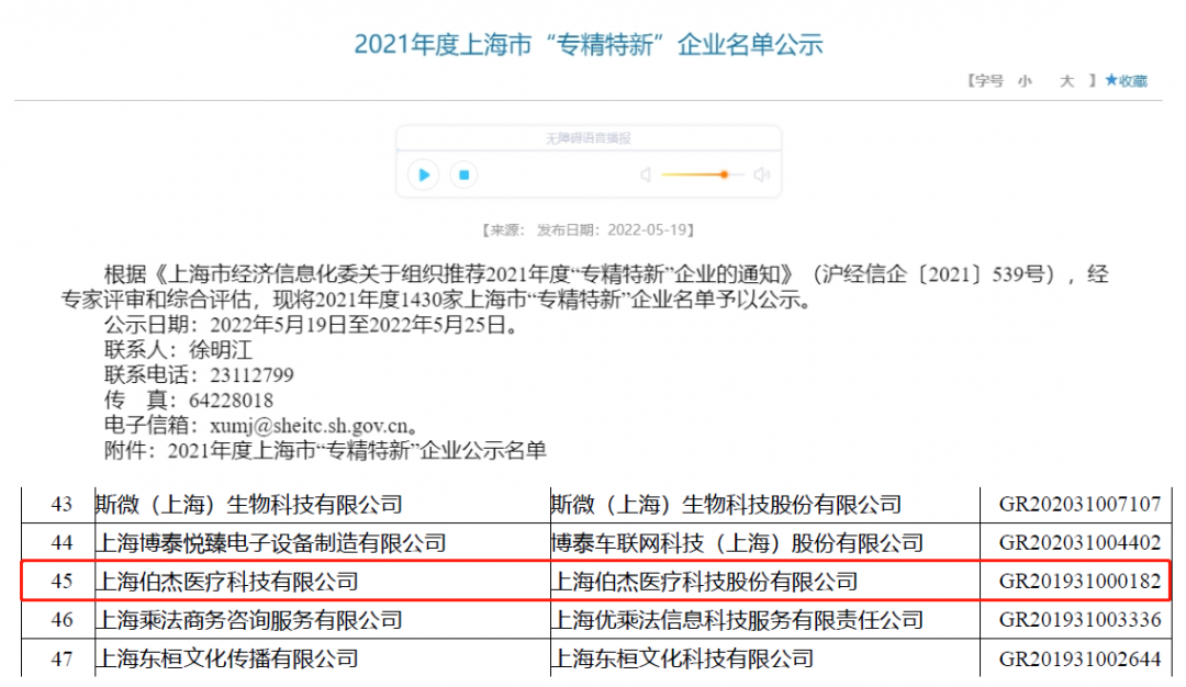 2021年度上海市“專精特新”企業(yè)名單已公示結(jié)束,今日正式公布認(rèn)定名單。上海伯杰醫(yī)療科技股份有限公司(以下簡(jiǎn)稱“伯杰醫(yī)療”)憑借在專業(yè)化、精細(xì)化、特色化、新穎化方面的卓越表現(xiàn)和行業(yè)影響力,成功入選!