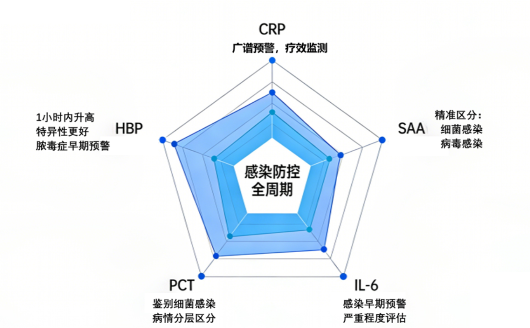 而早期精準識別感染類型、評估炎癥程度是降低死亡率的關鍵。傳統(tǒng)感染檢測手段存在特異性不足、預警滯后等局限,難以滿足臨床快速診斷需求?;诨瘜W發(fā)光技術的炎癥因子五項(CRP、SAA、IL-6、PCT、HBP)檢測,憑借“早、準、特”的核心優(yōu)勢,成為感染防控體系的核心支撐。