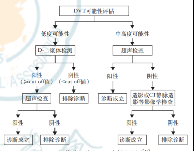 發(fā)生下肢 DVT 時,血液中D-二聚體的濃度升高。根據(jù)臨床DVT的可能性進行驗前概率評分(多采用Wells評分),對于Wells評分低度可能性的患者,先行D-二聚體檢測,陰性(低于cut-off 值)則排除DVT,陽性者進一步行血管超聲檢查,診斷流程如下: