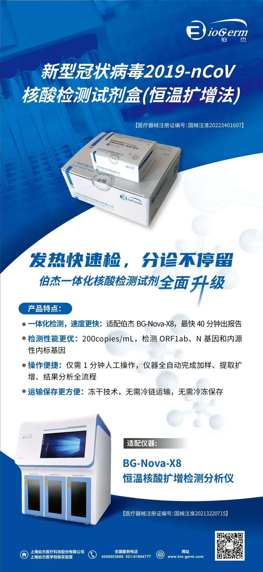 適配伯杰BG-Nova-X8,最快40分鐘出報告,大大縮短檢測時間及報告等待時間,提升發(fā)熱門診應(yīng)急處置能力。