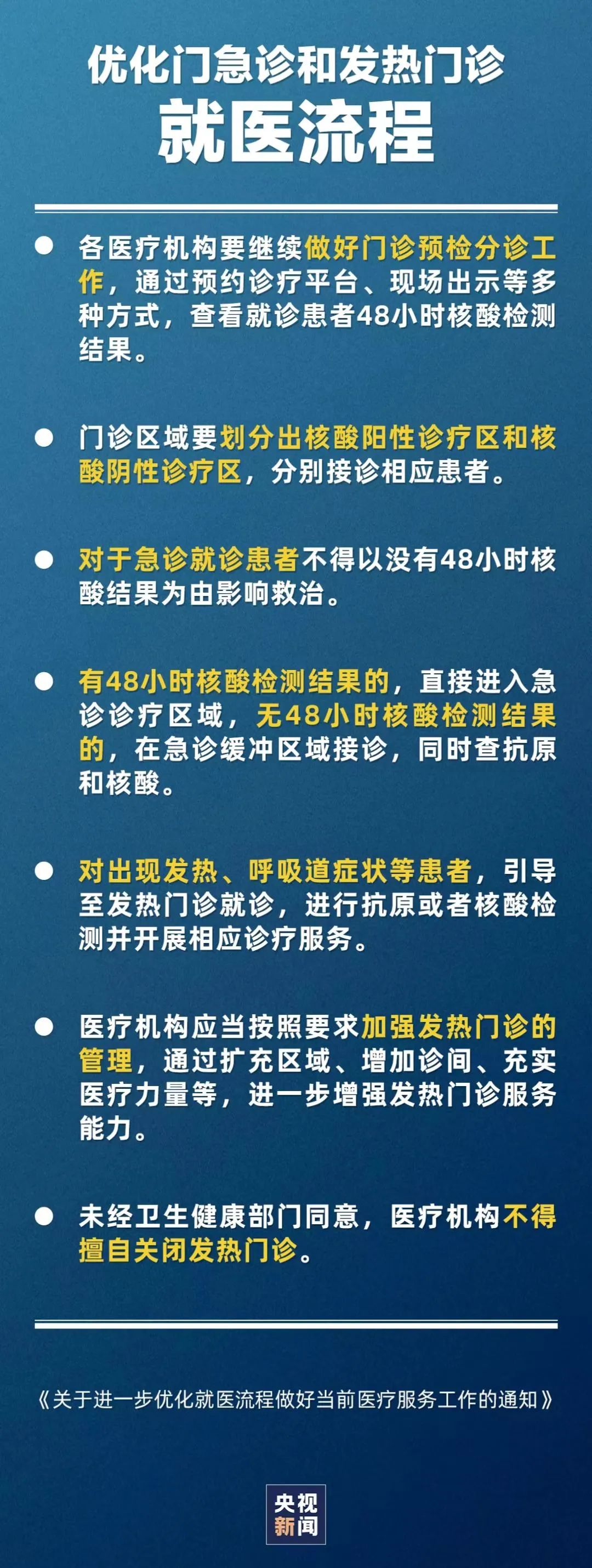 國務(wù)院"新十條"政策發(fā)布后,為進(jìn)一步優(yōu)化就醫(yī)流程,最大限度減少醫(yī)院交叉感染,保障患者和醫(yī)務(wù)人員安全,國務(wù)院聯(lián)防聯(lián)控機(jī)制12月7日發(fā)布《關(guān)于進(jìn)一步優(yōu)化就醫(yī)流程做好當(dāng)前醫(yī)療服務(wù)工作的通知》,通知規(guī)定: