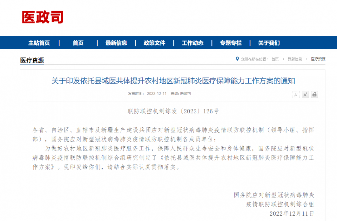 并在12月11日發(fā)布了綱領(lǐng)性的指導(dǎo)文件《關(guān)于印發(fā)依托縣域醫(yī)共體提升農(nóng)村地區(qū)新冠肺炎醫(yī)療保障能力工作方案的通知》,通知規(guī)定: 12月底前有條件的鄉(xiāng)鎮(zhèn)衛(wèi)生院開設(shè)發(fā)熱診室(門診),并具備24小時內(nèi)啟用、正常運行的能力,切實加強(qiáng)預(yù)檢分診工作。加快推進(jìn)發(fā)熱診室(門診)建設(shè),力爭到2023年3月底覆蓋率提高到90%左右。