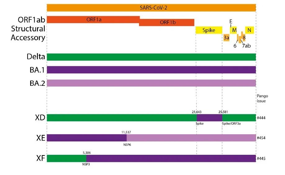 當(dāng)前根據(jù)水平掃描可以確認(rèn)有3個(gè)重組變異株,分別是XD, XE, 和XF。屬于按pango體系分類。其中XD和XF都是Omicron BA.1和Delta變體的重組,XE則是Omicron BA.1 和BA.2的重組體。