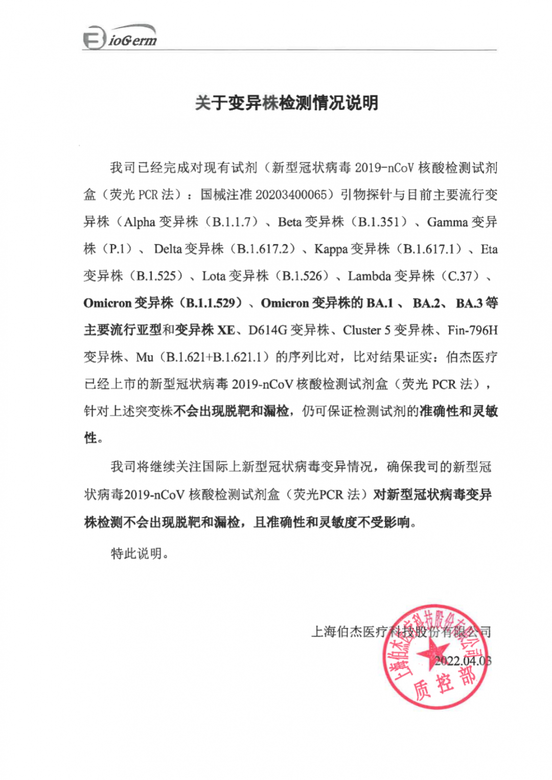 伯杰醫(yī)療已經(jīng)完成對現(xiàn)有試劑(新型冠狀病毒2019-nCoV核酸檢測試劑盒(熒光PCR法): 國械注準(zhǔn)20203400065)引物探針與目前主要流行變異株的序列對比,針對變異株XE內(nèi)等主流變異株不會(huì)出現(xiàn)脫靶和漏檢,仍可保證檢測試劑的準(zhǔn)確性和靈敏性。