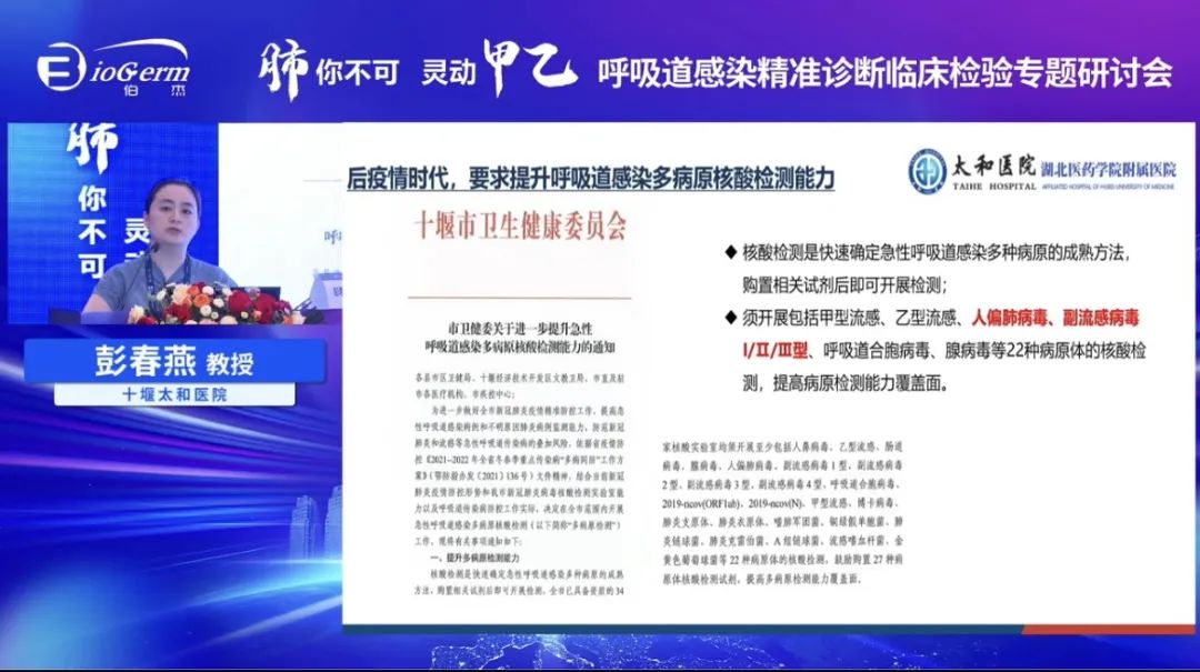 彭春艷教授在會(huì)上做了《呼吸道多重核酸檢測的機(jī)遇與應(yīng)用實(shí)踐》的報(bào)告:強(qiáng)調(diào)感染性疾病嚴(yán)重威脅人類的健康,在呼吸道感染中病毒是最主要的病原,在病毒的感染診斷中核酸檢測是主要的首選方法。中小panel的呼吸道核酸多聯(lián)檢產(chǎn)品能夠滿足臨床門診、住院患者的檢測需求。多重PCR的產(chǎn)品能增加混合感染的檢出率,因此已被廣泛應(yīng)用開展。