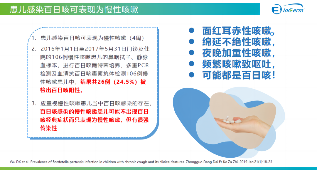 [3]Wu DX.et al Prevalence of Bordetella pertussis infection in children with chronic cough and its clinical features. Zhongguo Dang Dai Er Ke Za Zhi. 2019 Jan;21(1):18-23