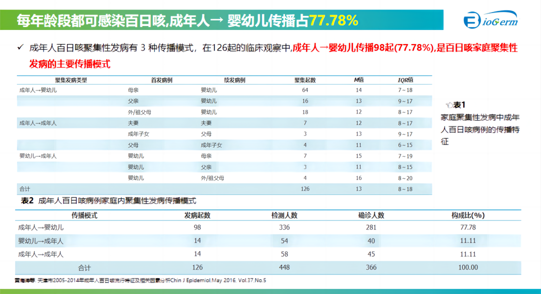 中國《百日咳行動計劃專家共識》指出:成年人百日咳聚集性發(fā)病有3種傳播模式,為成年人傳播給嬰幼兒、成人傳染給成人、嬰幼兒傳染給成人。在126起臨床觀察中,成年人→嬰幼兒傳播98起占77.78%,是百日咳家庭聚集性發(fā)病的主要傳播模式[2]。