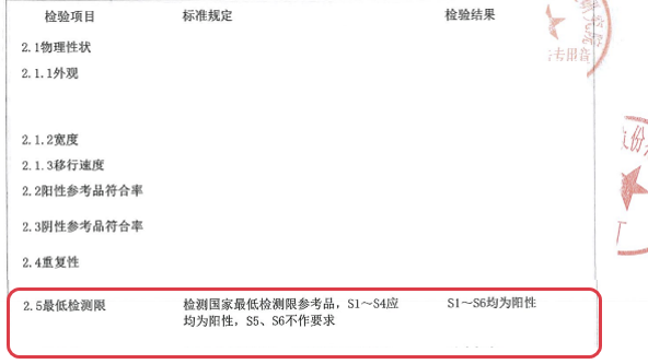 新型冠狀病毒抗原檢測(cè)試劑國(guó)家最低檢測(cè)限參考品S梯度稀釋得到S1-S6,S6為原液1600倍稀釋。國(guó)家最低檢測(cè)限參考品規(guī)定S1-S4應(yīng)為陽性,S5,S6不做要求。伯杰醫(yī)療新冠抗原檢測(cè)試劑靈敏度高,S1-S6檢出均為陽性,性能符合國(guó)家規(guī)定,并高于國(guó)家規(guī)定。