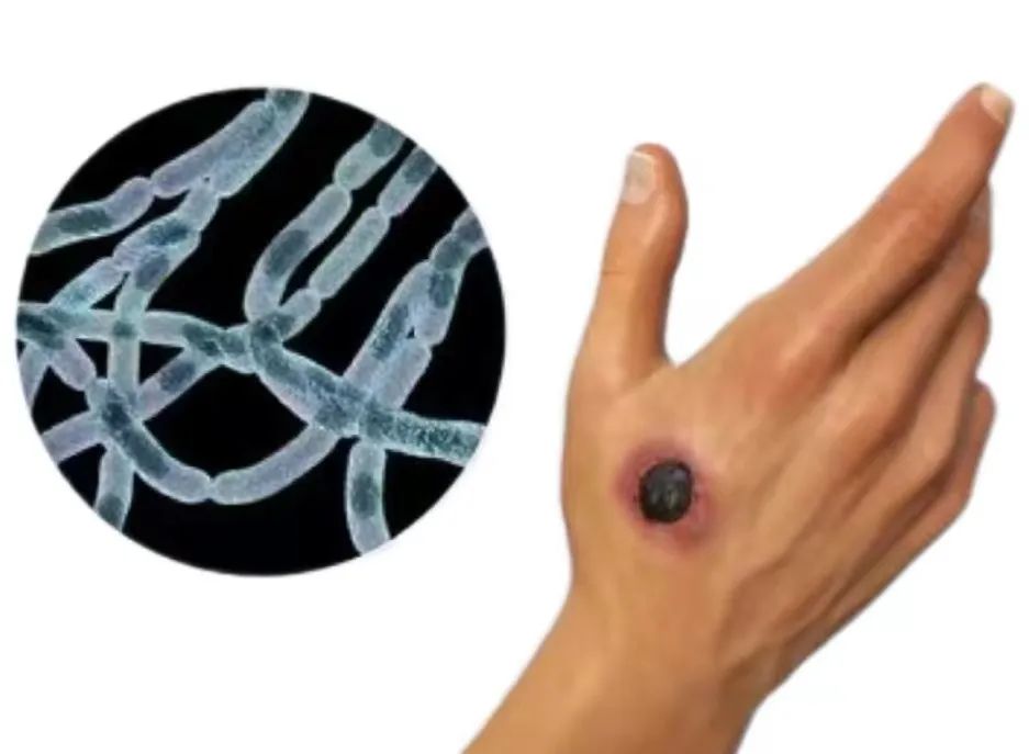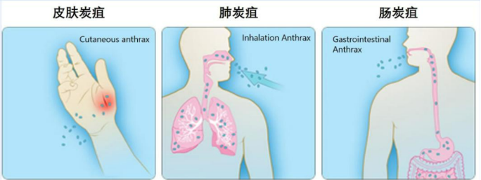 炭疽根據(jù)感染途徑分為皮膚炭疽、肺炭疽、腸炭疽等類型。