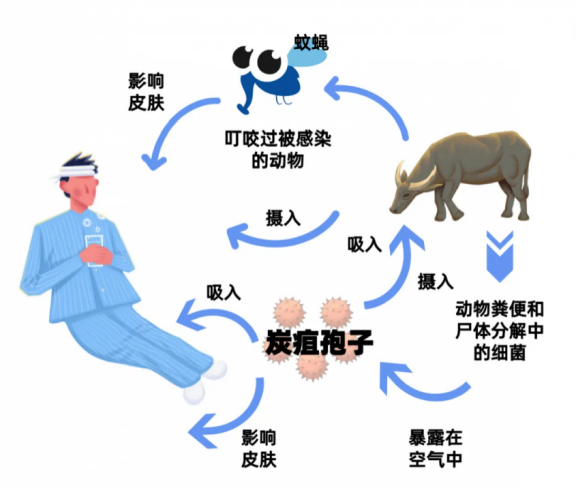 食草動物在感染炭疽芽孢桿菌后,可經(jīng)血液、排泄物、乳汁等直接傳播給人類或污染環(huán)境,是感染的重要來源,感染途徑有如下三種: