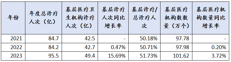 當前,我國基層醫(yī)療現(xiàn)狀顯示,基層醫(yī)療機構數(shù)量、診療人次及占比逐年增長,特別是2023年,基層診療人次同比增長15.69%,充分體現(xiàn)基層醫(yī)療在現(xiàn)代醫(yī)療衛(wèi)生體系中的重要作用。