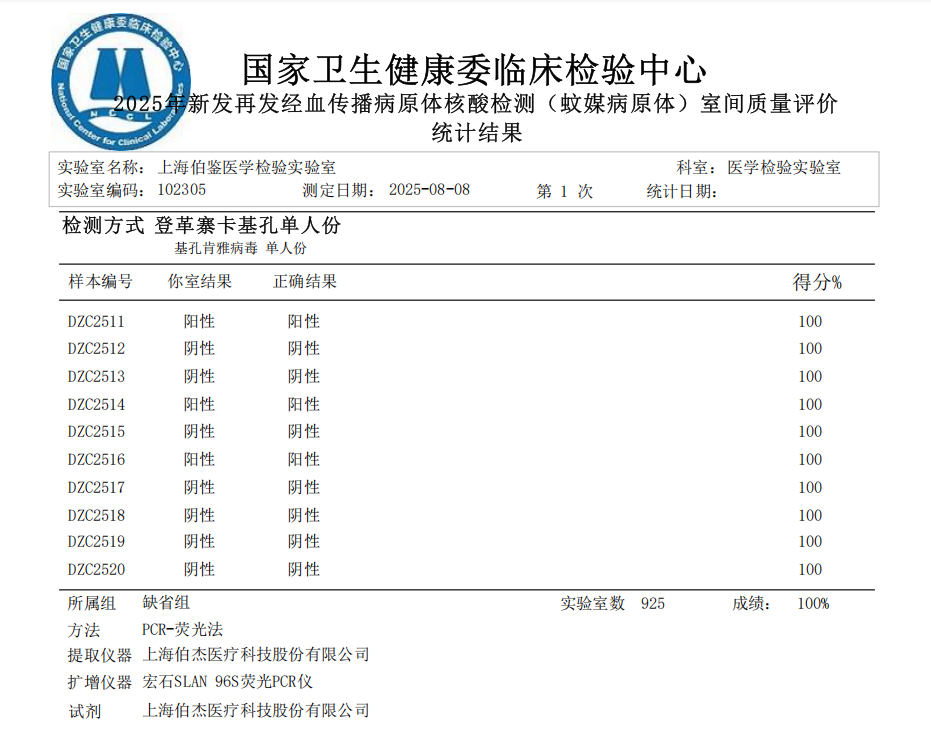 近日,國(guó)家衛(wèi)生健康委臨床檢驗(yàn)中心(NCCL)正式公布“2025年度全國(guó)基孔肯雅病毒核酸檢測(cè)室間質(zhì)量評(píng)價(jià)預(yù)研活動(dòng)”和“2025年新發(fā)再發(fā)經(jīng)血傳播病原體核酸檢測(cè)(蚊媒病原體)室間質(zhì)量評(píng)價(jià)”結(jié)果,上海伯鑒醫(yī)學(xué)檢驗(yàn)實(shí)驗(yàn)室憑借嚴(yán)謹(jǐn)?shù)馁|(zhì)量管理體系和精準(zhǔn)的檢測(cè)能力,以?xún)?yōu)異成績(jī)通過(guò)本次評(píng)估,充分彰顯了其在感染性疾病分子診斷領(lǐng)域的專(zhuān)業(yè)實(shí)力。