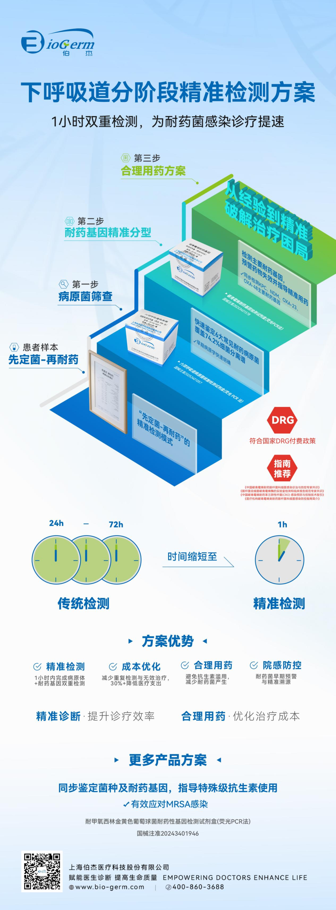 我國(guó)下呼吸道感染的病原體構(gòu)成以細(xì)菌為主。Chinet 2023年監(jiān)測(cè)數(shù)據(jù)顯示,臨床分離的主要致病菌包括肺炎克雷伯菌、鮑曼不動(dòng)桿菌、流感嗜血桿菌、銅綠假單胞菌、金黃色葡萄球菌、肺炎鏈球菌等。伯杰醫(yī)療的六項(xiàng)呼吸道病原菌核酸檢測(cè)試劑盒與耐甲氧西林金黃色葡萄球菌(MRSA)耐藥性基因檢測(cè)試劑盒聯(lián)合使用,可覆蓋74.2%的臨床常見細(xì)菌分離譜,為病原學(xué)診斷提供重要支持。