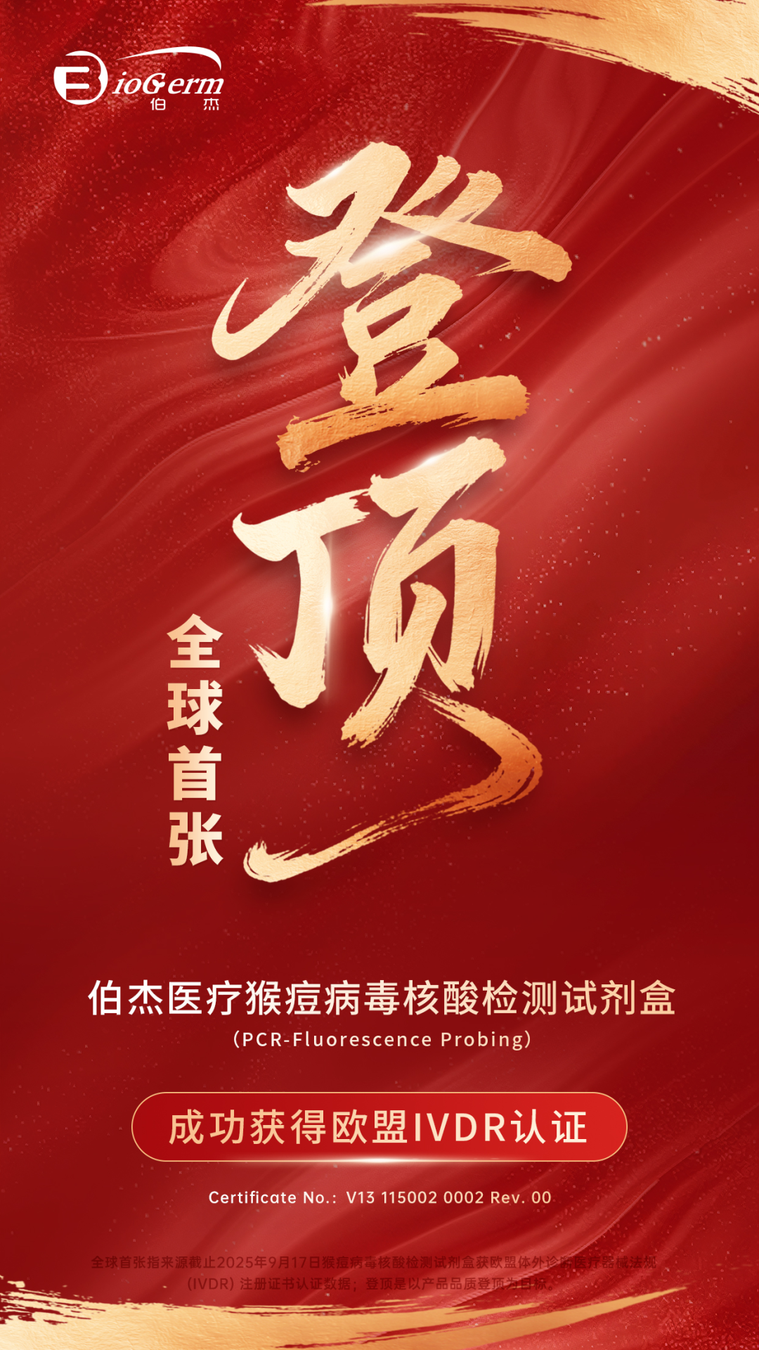 伯杰醫(yī)療此次獲得的全球首張猴痘檢測IVDR證書(Certificate No.:V13 115002 0002 Rev. 00),不僅是對產(chǎn)品卓越性能的肯定,更是中國診斷企業(yè)研發(fā)實力、質(zhì)量管理體系和臨床驗證能力全面達到國際頂尖水平的鐵證。