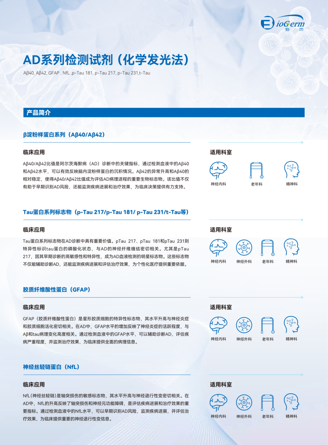 上海伯杰醫(yī)療科技股份有限公司的AD系列檢測試劑,也引起了參會專家學者的高度關注。伯杰醫(yī)療AD系列檢測試劑依托高靈敏度化學發(fā)光技術,檢測靈敏度可到達百fg級別,可精準捕獲外周血中AD特異性生物標志物,包括Aβ42/40,pTau217,pTau181,GFAP,NfL等指標,可幫助臨床醫(yī)生基于“A+T+N”診斷框架進行疾病診斷,實現(xiàn) “一滴血” 對病患進行早期篩查,病癥分型,干預效果監(jiān)測等不同臨床用途需要。與會專家對此基于肯定,并給予進一步合作交流的期望。