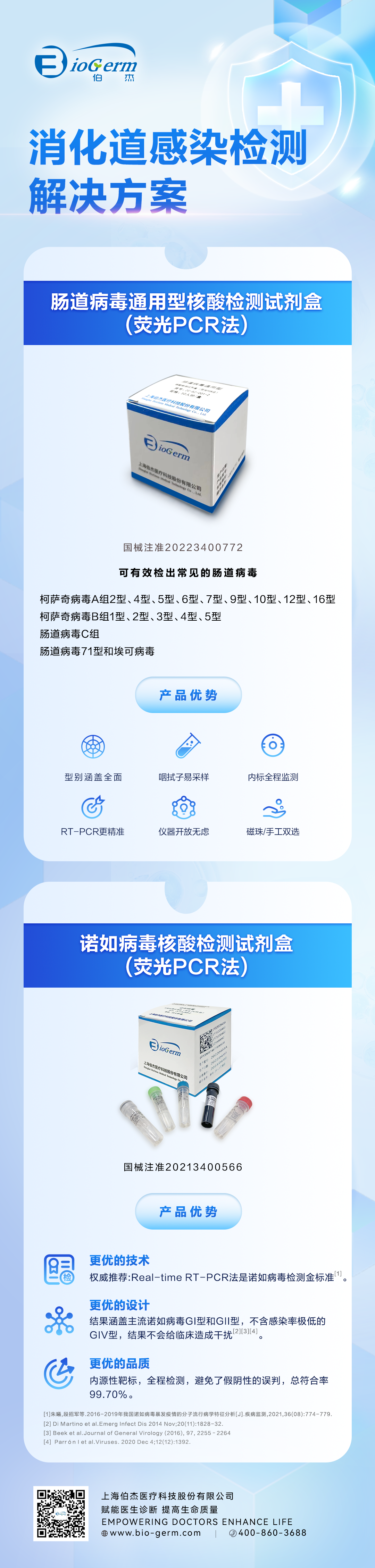 伯杰醫(yī)療消化道感染檢測(cè)解決方案針對(duì)腸道病毒和諾如病毒感染的精準(zhǔn)診斷需求,兩款產(chǎn)品基于熒光RT-PCR技術(shù),能夠快速、準(zhǔn)確地檢測(cè)相關(guān)病毒,為臨床早期診斷和公共衛(wèi)生防控提供有力支持,有助于實(shí)現(xiàn)手足口病和諾如病毒感染的早發(fā)現(xiàn)、早干預(yù),降低重癥發(fā)生率和疫情傳播風(fēng)險(xiǎn)。