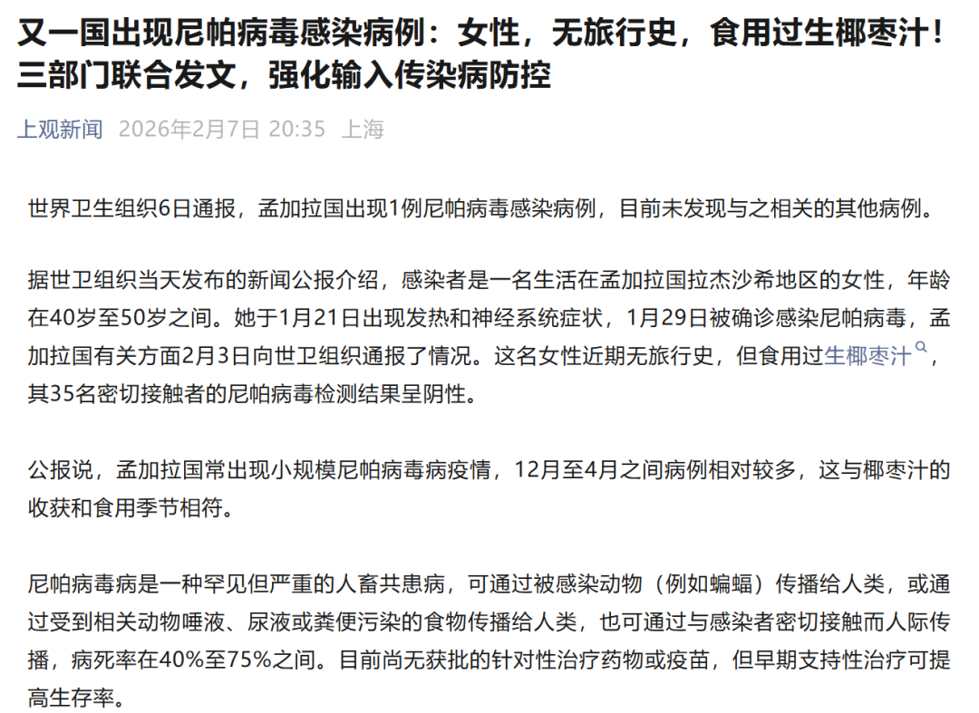 近日,南亞地區(qū)尼帕病毒(NiV)活躍度持續(xù)引發(fā)國(guó)際公共衛(wèi)生關(guān)注。繼2026年1月下旬印度西孟加拉邦報(bào)告2例醫(yī)護(hù)人員感染病例后,世界衛(wèi)生組織6日通報(bào),孟加拉國(guó)出現(xiàn)1例尼帕病毒感染病例,目前暫無擴(kuò)散跡象,但仍凸顯該病毒在流行區(qū)的持續(xù)威脅。