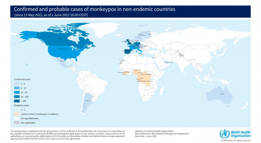 截止6月1日,非猴痘流行區(qū)域共發(fā)現(xiàn)疑似/確診猴痘病例643例(其中2例疑似),廣泛分布在26個(gè)國家。