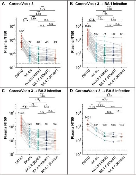 接受三劑CoronaVac而沒有感染的人的血漿樣本顯示,與針對BA.4/BA.5的中和滴度(NT50)相比, R346I(BA.5.9)、R346T(BA.4.6和BF.7)和R346S(BA.4.7)的中和滴度(NT50)下降1.5至1.7倍(圖2A)。在BA.1或BA.2突破性感染康復者的血漿中也觀察到類似的中和滴度降低(圖2B-C)。且?guī)в蠷346I/T/S的BA.4/BA.5可以明顯逃避來自BA.5突破性感染的血漿樣本的中和反應,表現(xiàn)出2.4至2.6倍的NT50下降(圖2D)。這些結果表明具有R346突變的BA.4/BA.5亞系具有很強的體液免疫逃避能力,包括BA.4.6、BA.4.7、BA.5.9和BF.7等在內的BA.4/BA.5亞系,在BA.4/BA.5引起的全球大流行背景下將獲得傳播性優(yōu)勢。